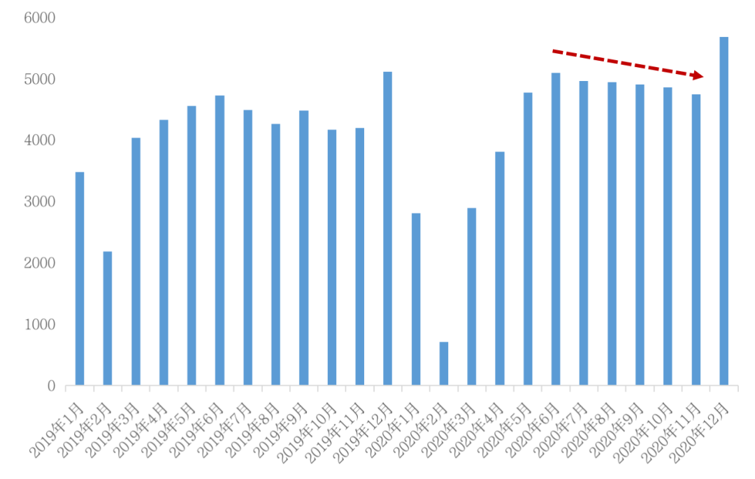 圖:2020年1-12月100個典型城市新建商品住宅月度成交情況(單位:萬平方米)