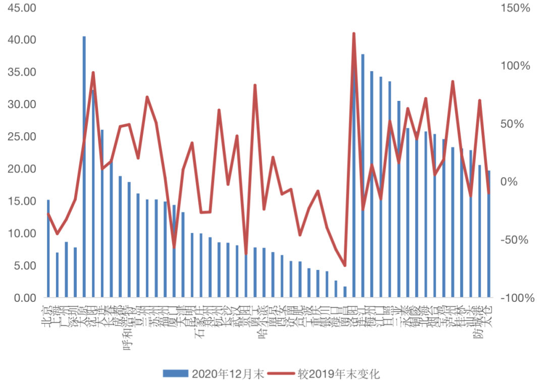 截至到12月末CRIC監測的100個重點城市庫存量達到了57995萬平方米,較2019年末上升了9%,不同城市漲跌參半,百城中有14個庫存消化周期高于24個月,大部分為缺乏基本面支撐的三四線城市,庫存風險浮出水面。