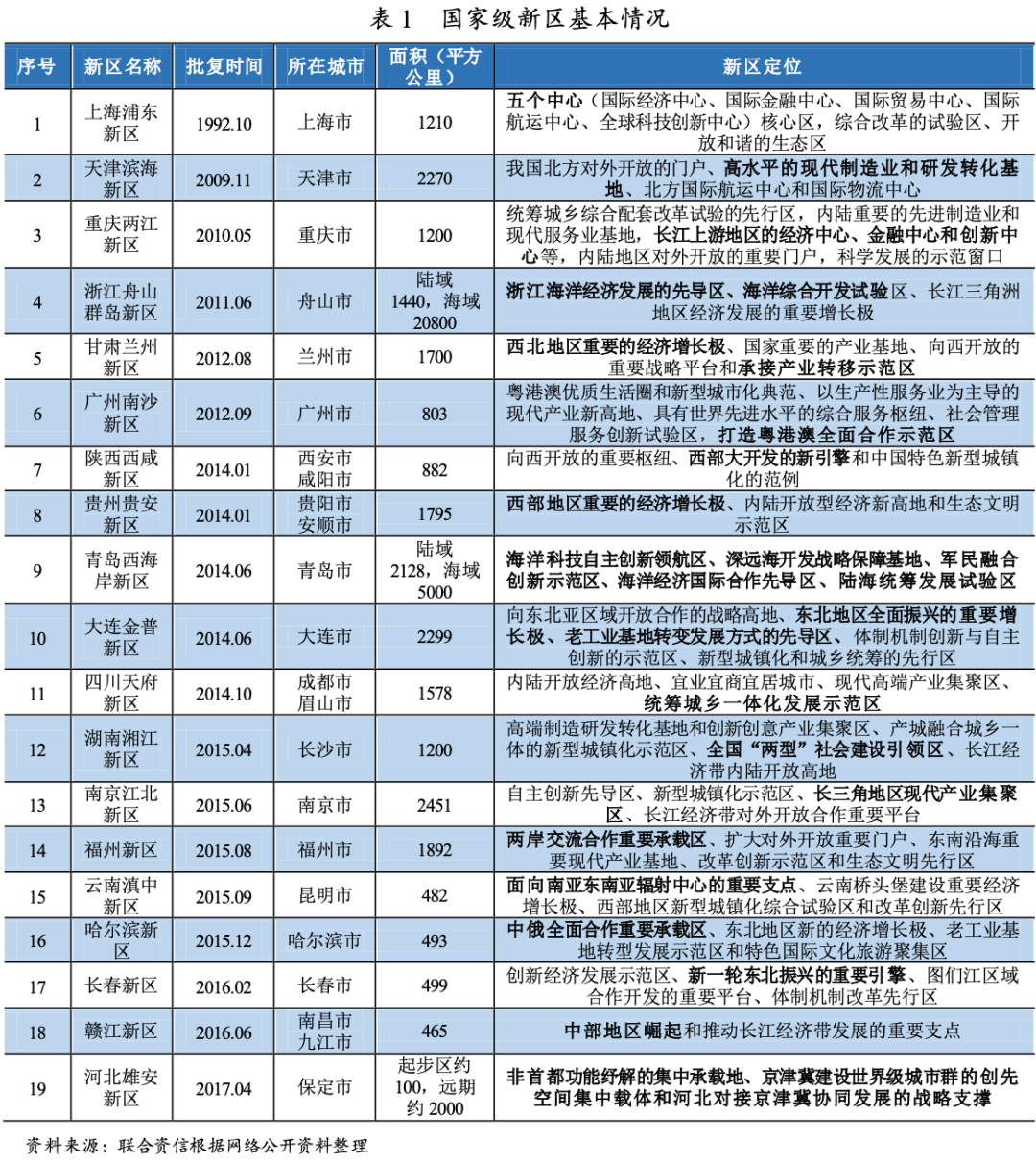 國(guó)家級(jí)新區(qū)是由國(guó)務(wù)院批準(zhǔn)設(shè)立,承擔(dān)國(guó)家重大發(fā)展和改革開(kāi)放戰(zhàn)略任務(wù)的綜合功能區(qū)。自1992年上海浦東新區(qū)獲批以來(lái),我國(guó)已有19個(gè)國(guó)家級(jí)新區(qū)。國(guó)家級(jí)新區(qū)規(guī)劃面積大、范圍廣,資源環(huán)境承載能力強(qiáng),作為引領(lǐng)區(qū)域經(jīng)濟(jì)發(fā)展的新引擎,其長(zhǎng)期規(guī)劃發(fā)展得到了多方位的保障。
