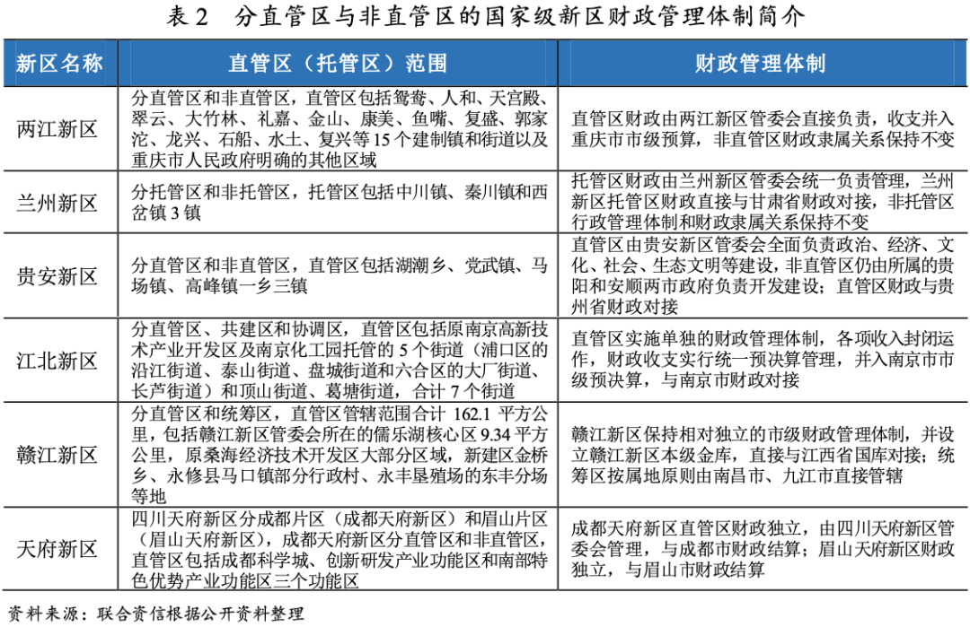 政府型新區(qū)與政區(qū)合一型新區(qū)與正常行政區(qū)財(cái)政管理體制一致,均具備獨(dú)立財(cái)政并對(duì)接上級(jí)政府金庫(kù)直接與上級(jí)政府進(jìn)行結(jié)算,財(cái)政獨(dú)立性、靈活性強(qiáng)。管委會(huì)型新區(qū)財(cái)政管理體制差異較大:(1)部分新區(qū)分直管區(qū)和非直管區(qū),通常直管區(qū)是新區(qū)發(fā)展的起步區(qū)或重點(diǎn)區(qū)域,直管區(qū)具備獨(dú)立財(cái)政,非直管區(qū)保持原有的財(cái)政隸屬關(guān)系不變,此種情況下,新區(qū)財(cái)力更多反映的是直管區(qū)范圍內(nèi)產(chǎn)生的財(cái)政收入。