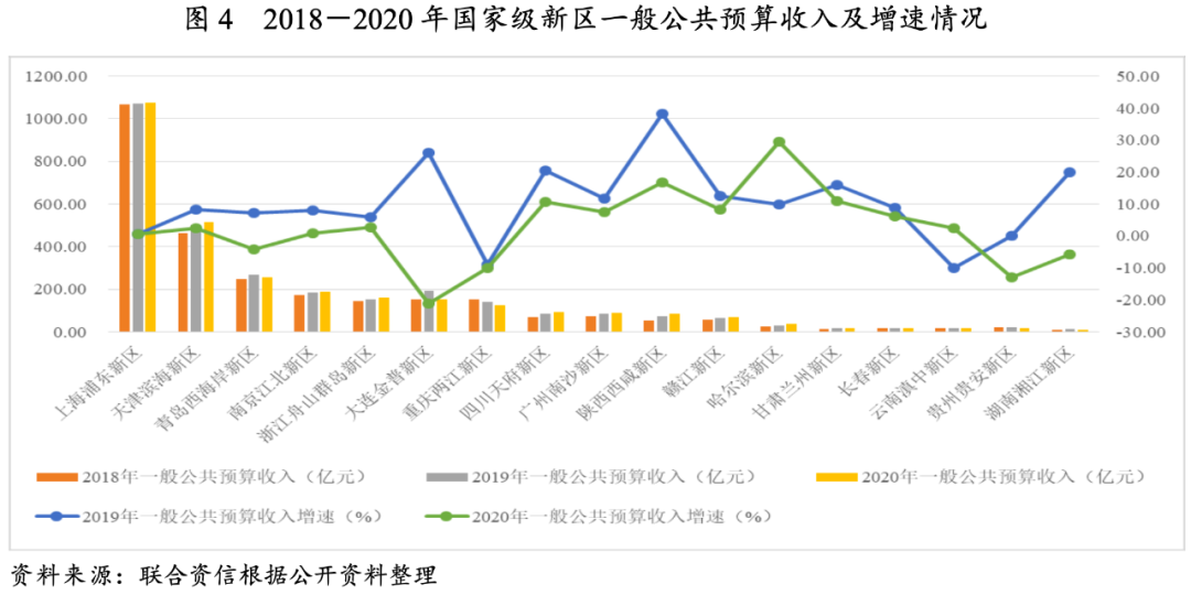 從增長(zhǎng)情況來(lái)看,2020年受疫情及減稅降費(fèi)政策等因素影響,國(guó)家級(jí)新區(qū)一般公共預(yù)算收入增速普遍下降,金普新區(qū)、貴安新區(qū)、兩江新區(qū)等一般公共預(yù)算收入降幅明顯。