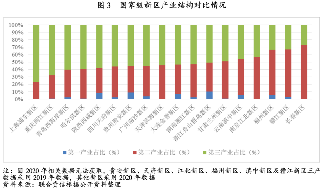 新區(qū)定位、產(chǎn)業(yè)基礎(chǔ)、產(chǎn)業(yè)規(guī)劃及布局造就國(guó)家級(jí)新區(qū)不同的產(chǎn)業(yè)結(jié)構(gòu),賦予國(guó)家級(jí)新區(qū)不同的創(chuàng)稅能力。現(xiàn)階段國(guó)家級(jí)新區(qū)產(chǎn)業(yè)結(jié)構(gòu)分化明顯,浦東新區(qū)定位“五個(gè)中心”,主導(dǎo)金融、航運(yùn)、貿(mào)易、電子信息、智能制造等產(chǎn)業(yè),第三產(chǎn)業(yè)占比高達(dá)76.85%;兩江新區(qū)定位為長(zhǎng)江上游地區(qū)的經(jīng)濟(jì)中心、金融中心和創(chuàng)新中心,第三產(chǎn)業(yè)占比緊隨浦東新區(qū);貴安新區(qū)依托“大數(shù)據(jù)”提供信息服務(wù)拉升第三產(chǎn)業(yè)占比。蘭州新區(qū)定位為承接產(chǎn)業(yè)轉(zhuǎn)移示范區(qū)、重點(diǎn)布局石化、裝備制造、綠色冶金等產(chǎn)業(yè),福州新區(qū)電子器件、化纖紡織、玻璃陶瓷等制造業(yè)發(fā)達(dá),贛江新區(qū)主導(dǎo)光電信息、生物醫(yī)藥、智能裝備制造、新能源與新材料、有機(jī)硅、現(xiàn)代輕紡等六大產(chǎn)業(yè),長(zhǎng)春新區(qū)以汽車制造、醫(yī)藥制造、黑色金屬冶煉等為支柱產(chǎn)業(yè),以上新區(qū)第二產(chǎn)業(yè)占比均超過(guò)50%。