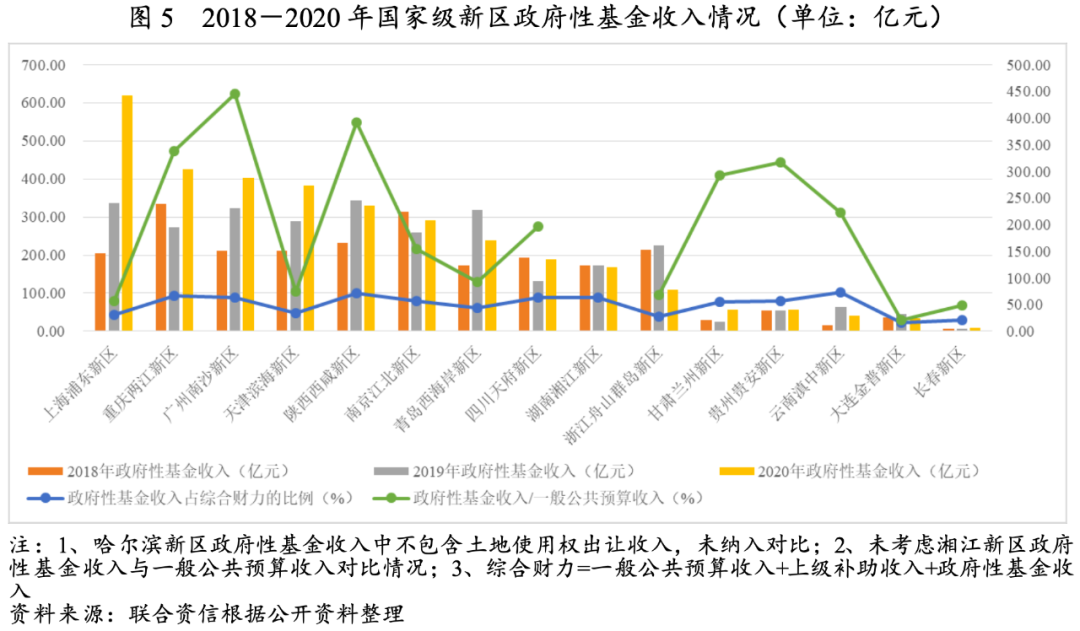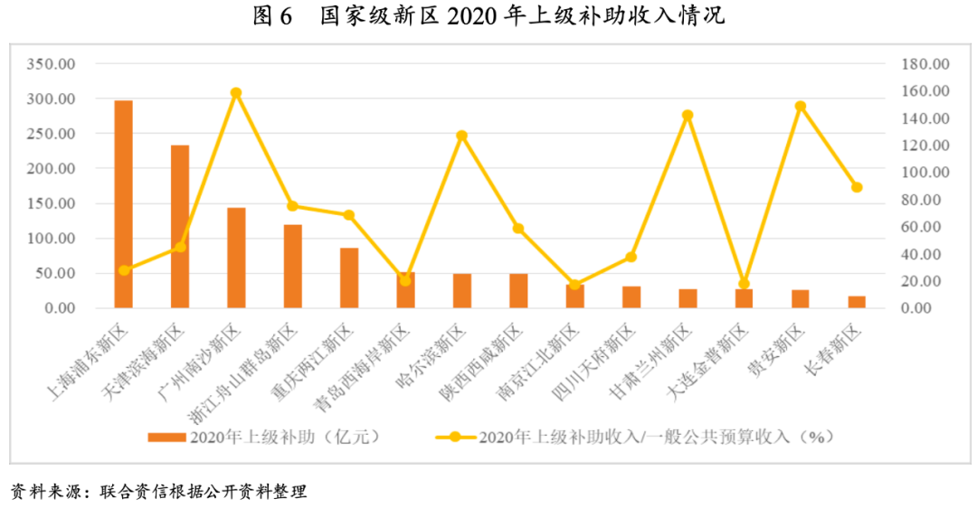 因成立時(shí)間、定位及財(cái)政結(jié)算體制等不同,國(guó)家級(jí)新區(qū)具體獲得的支持存在較大差異。南沙新區(qū)、貴安新區(qū)、蘭州新區(qū)及哈爾濱新區(qū)等上級(jí)補(bǔ)助收入對(duì)新區(qū)綜合財(cái)力貢獻(xiàn)大。