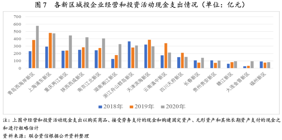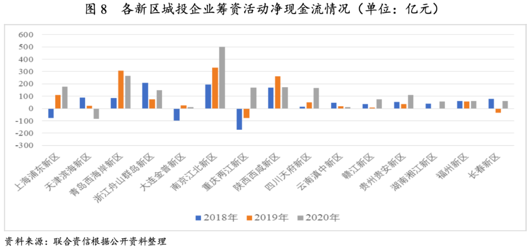 國(guó)家級(jí)新區(qū)整體存在較大融資需求,各新區(qū)城投企業(yè)投資需求不同且資金投向有所分化。伴隨著新區(qū)開(kāi)發(fā)建設(shè)的逐步推進(jìn),絕大多數(shù)新區(qū)城投企業(yè)籌資活動(dòng)呈凈流入狀態(tài)。