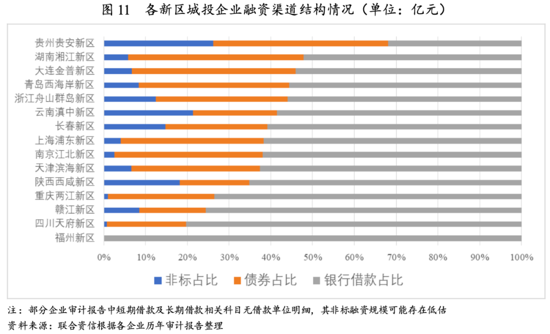 國(guó)家級(jí)新區(qū)城投企業(yè)融資渠道結(jié)構(gòu)差異較大,部分新區(qū)城投企業(yè)融資渠道結(jié)構(gòu)有所失衡,非標(biāo)及債券市場(chǎng)融資占比較高。