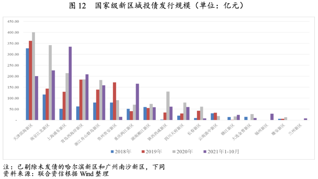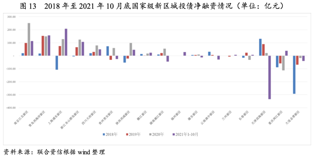 從凈融資規(guī)模來(lái)看,國(guó)家級(jí)新區(qū)城投債凈融資情況分化明顯,2018年至2021年10月底,金普新區(qū)、兩江新區(qū)、濱海新區(qū)和長(zhǎng)春新區(qū)城投債凈融資為負(fù)。其中,兩江新區(qū)2020年以來(lái)城投債集中到期、償還量較大導(dǎo)致報(bào)告期間城投債累計(jì)凈融資為負(fù);金普新區(qū)、濱海新區(qū)和長(zhǎng)春新區(qū)則更多受區(qū)域融資環(huán)境拖累。同期,其他新區(qū)城投債融資均呈凈流入狀態(tài),江北新區(qū)和西海岸新區(qū)城投債凈融資規(guī)模均超過(guò)450億元,明顯領(lǐng)先于其他新區(qū);滇中新區(qū)及蘭州新區(qū)城投債凈融資規(guī)模較小。