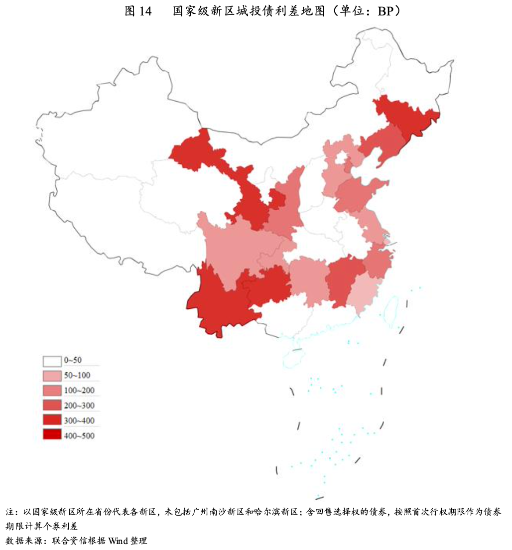 不同新區(qū)城投企業(yè)債券發(fā)行利差分化明顯,浦東新區(qū)、福州新區(qū)、雄安新區(qū)等新區(qū)城投債發(fā)行利差較低,貴安新區(qū)、滇中新區(qū)、長(zhǎng)春新區(qū)、蘭州新區(qū)等城投債發(fā)行利差較高。