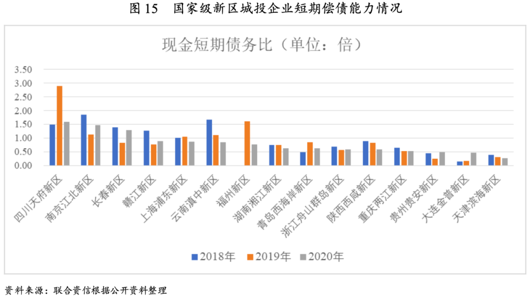 2018-2020年底,國(guó)家級(jí)新區(qū)城投企業(yè)短期償債能力指標(biāo)整體弱化。2020年底,國(guó)家級(jí)新區(qū)城投企業(yè)現(xiàn)金短期債務(wù)比下降至0.66倍,大多數(shù)新區(qū)發(fā)債城投存在短期償付壓力。具體來(lái)看,各新區(qū)城投短期償債能力指標(biāo)表現(xiàn)明顯分化,其中浦東新區(qū)、江北新區(qū)、四川天府新區(qū)城投企業(yè)凈融資規(guī)模較大、賬面資金較充裕;長(zhǎng)春新區(qū)開(kāi)發(fā)投資進(jìn)度較慢、相關(guān)城投企業(yè)賬面留存較大規(guī)模現(xiàn)金,以上新區(qū)城投企業(yè)短期償債能力指標(biāo)表現(xiàn)較強(qiáng)。濱海新區(qū)、金普新區(qū)和貴安新區(qū)城投企業(yè)短期償債能力指標(biāo)較弱,其中,濱海新區(qū)城投企業(yè)短期債務(wù)規(guī)模大,近三年現(xiàn)金短期債務(wù)比持續(xù)下降,流動(dòng)性壓力較為突出。隨著債務(wù)集中到期,兩江新區(qū)、西咸新區(qū)和湘江新區(qū)等新區(qū)城投企業(yè)短期償債能力有所弱化。