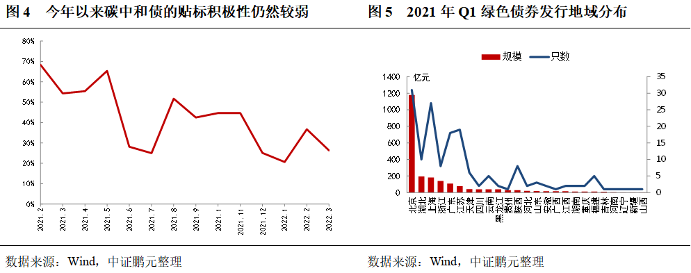 2022年Q1碳中和債共發(fā)行621.08億元,占綠色債券總體發(fā)行規(guī)模的27.68%,分月度來(lái)看,今年以來(lái)碳中和債的貼標(biāo)積極性仍然較弱。2022年Q1城投公司發(fā)行綠色債券仍然受融資政策趨嚴(yán)影響,僅發(fā)行180.80億元,占非金融企業(yè)綠色債券總發(fā)行規(guī)模的12.47%。從區(qū)域分布來(lái)看,北京發(fā)行規(guī)模仍遙遙領(lǐng)先,2022年Q1湖北發(fā)行綠色債券194.20億元,位居發(fā)行規(guī)模第二位,主要受中國(guó)長(zhǎng)江三峽集團(tuán)有限公司總部由北京搬遷至武漢影響