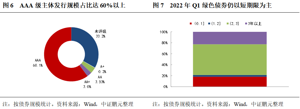 從發(fā)行人企業(yè)性質(zhì)來(lái)看,國(guó)企依然是絕對(duì)主力,央企發(fā)行綠色債券規(guī)模最大。相應(yīng)地,從發(fā)行主體信用等級(jí)看,2022年一季度AAA級(jí)發(fā)行規(guī)模占比達(dá)到60.13%。此外,受債券市場(chǎng)取消強(qiáng)制評(píng)級(jí)影響,未評(píng)級(jí)主體綠色信用債券的發(fā)現(xiàn)規(guī)模占比升至33.2%。從期限分布來(lái)看,2022年Q1綠色債券仍以3年期(含)以內(nèi)短期限為主,發(fā)行規(guī)模占比77.11%。