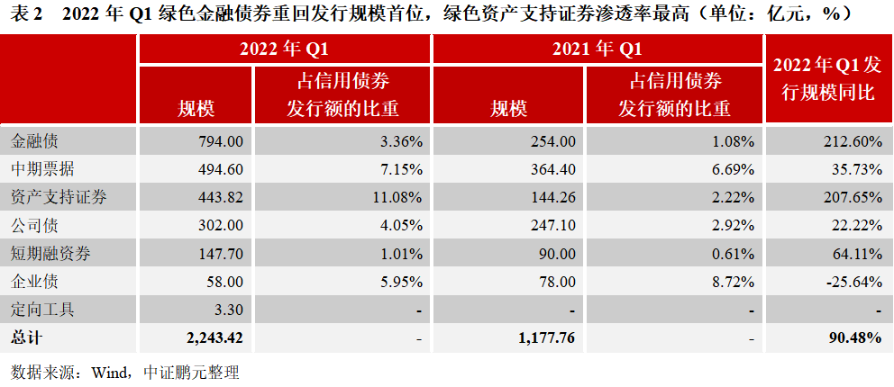 一季度綠色債券市場(chǎng)發(fā)行規(guī)模同比增長(zhǎng)90.48%,凈融資規(guī)模已超過(guò)去年全年的一半。綠色金融債券重回發(fā)行規(guī)模首位,綠色資產(chǎn)支持證券滲透率最高,達(dá)11.08%。