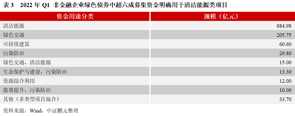 從資金用途來(lái)看,我們的分類標(biāo)準(zhǔn)參照《綠色債券支持項(xiàng)目目錄(2021年版)》中的二級(jí)項(xiàng)目分類,除綠色服務(wù)類項(xiàng)目外,綠色項(xiàng)目被分為能效提升、可持續(xù)建筑、污染防治、水資源節(jié)約和非常規(guī)水資源利用、資源綜合利用、綠色交通、綠色農(nóng)業(yè)、清潔能源、生態(tài)保護(hù)與建設(shè)9大類。由于綠色金融債未明確具體的募投項(xiàng)目,因此我們考察非金融企業(yè)綠色債券的資金用途。2022年Q1清潔能源仍是第一大資金用途領(lǐng)域,發(fā)行規(guī)模為884.98億元,占非金融企業(yè)綠色債券發(fā)行規(guī)模的61.06%,接下來(lái)是綠色交通、可持續(xù)建筑、污染防治。其中,前三大資金用途領(lǐng)域均是碳中和債券領(lǐng)域。