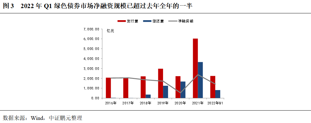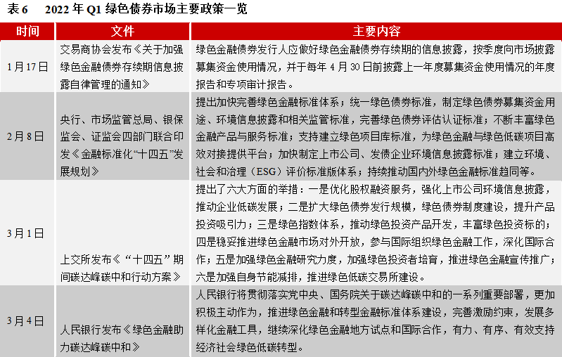 2022年3月5日的《政府工作報(bào)告》中提到“發(fā)展綠色金融,加快形成綠色低碳生產(chǎn)生活方式。”交易商協(xié)會(huì)發(fā)文繼續(xù)強(qiáng)化綠色金融債券存續(xù)期信息披露管理。交易所在《“十四五”期間碳達(dá)峰碳中和行動(dòng)方案》中提到:擴(kuò)大綠色債券發(fā)行規(guī)模,推進(jìn)公募REITs業(yè)務(wù)綠色發(fā)展,并將適時(shí)修訂發(fā)布綠色債券相關(guān)規(guī)則,還將強(qiáng)化對(duì)綠色債券和綠色資產(chǎn)支持證券市場(chǎng)監(jiān)管,督促發(fā)行人按規(guī)定或約定用途使用募集資金,披露綠色項(xiàng)目進(jìn)展情況和環(huán)境效益,敦促中介機(jī)構(gòu)履職盡責(zé),規(guī)范第三方認(rèn)證機(jī)構(gòu)對(duì)綠色債券評(píng)估的質(zhì)量要求。