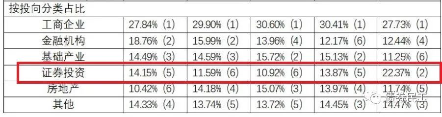 債券民工最關注的還是投向債券的信托規模。2021年度數據中,并未單獨披露投向債券的信托規模,只披露了投向證券投資的債券規數據。從這個數據也可以看出,2021年投向證券投資的占比大幅提升。