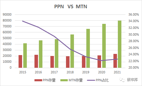 作為對(duì)比,交易商協(xié)會(huì)的私募品種定向工具PPN,在中長(zhǎng)期限品種中的占比近年來一直處于下降的趨勢(shì),規(guī)模穩(wěn)定在2萬億左右的水平。
