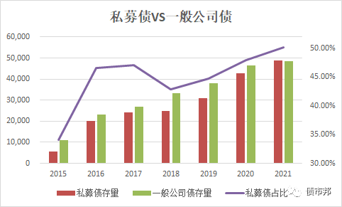 即便如此,依然擋不住逐利的市場(chǎng)行為,近年來私募債的占比一路攀升從,存量從2016年的2萬億規(guī)模上升到現(xiàn)在的4.8萬億。
