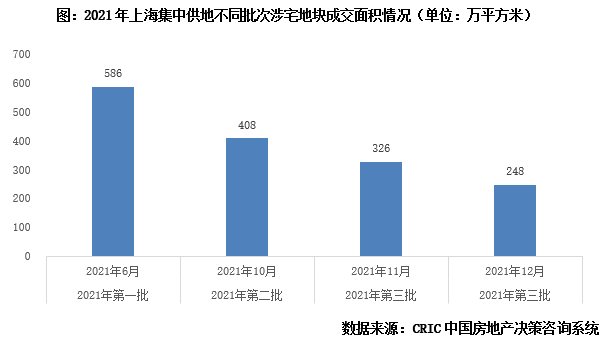 首先,供應總量層面,2021年恰逢集中供地,疊加“十四五”元年,上海政府供地力度明顯加大,土拍市場持續放量,全年涉宅用地成交量突破1500萬平方米。從供地節奏來看,共計三批次供地,第一批次6月和第三批次11-12月涉宅用地成交量分別達到586萬平方米和574萬平方米,迎來兩撥土拍成交高峰。