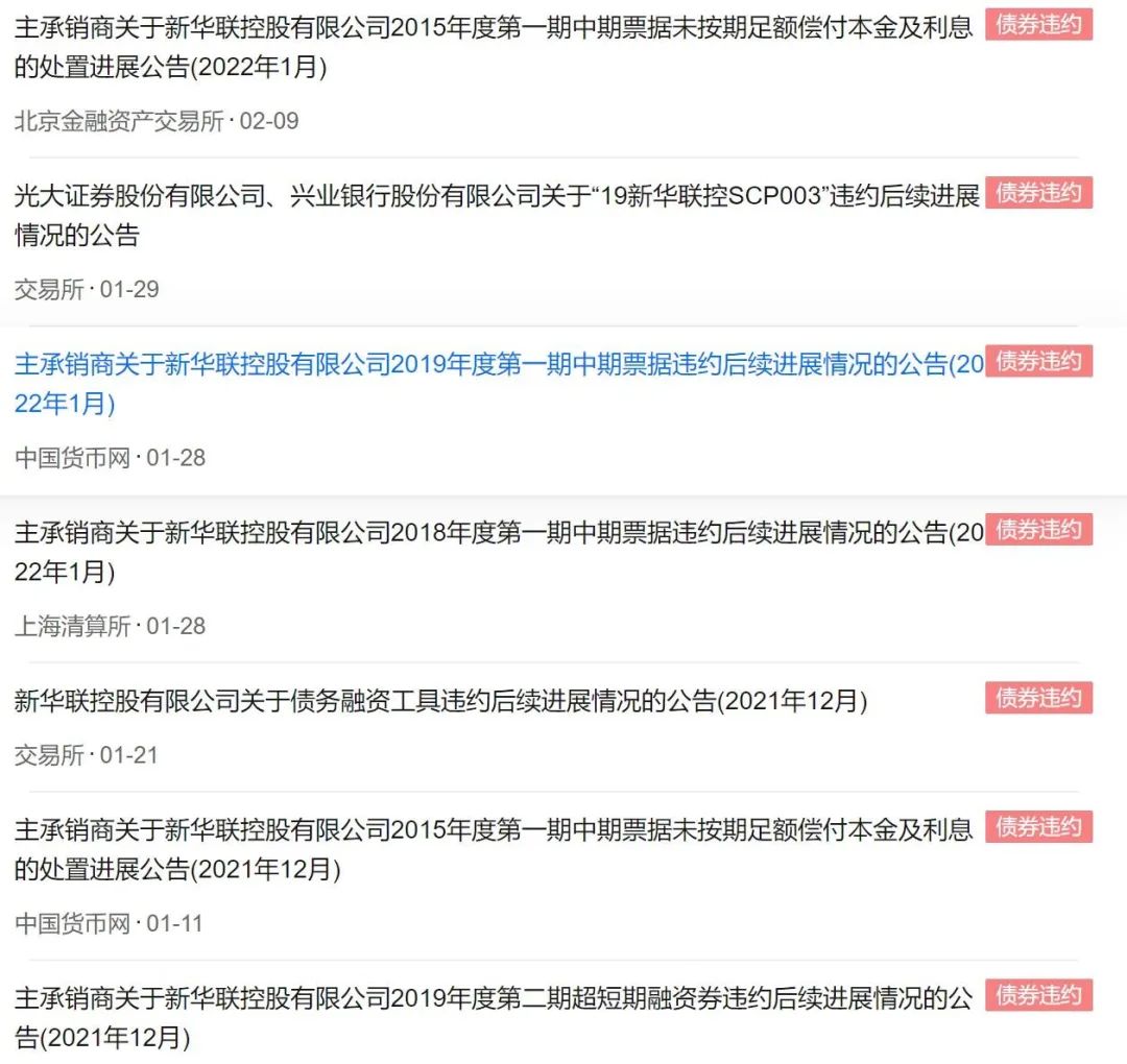 翻閱歷史公告,杠桿地產看到這并非新華聯首次債券違約。實際上在新華聯近兩年的公告消息里,其關于債券違約的相關內容披露占據了90%以上。