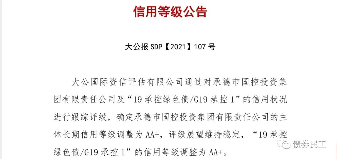 根據大公國際2021年6月28日出具的跟蹤評級報告,承德市國控投資集團有限責任公司(以下簡稱“承德國控”)的主體信用評級上調至AA+。本次評級上調的原因可能包括:承德市財政實力持續增強、發行人的重要地位、承德路橋和國投資產等國有資產劃入、主營業務的專營優勢等。