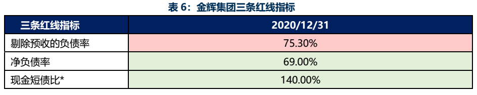 雖曾頻繁高溢價拿地,但相比于其他閩系的激進擴張,金輝集團的布局節奏顯然緩和許多,致使財務壓力較輕。截至2020年末,公司三條紅線僅踩1條,為黃檔。