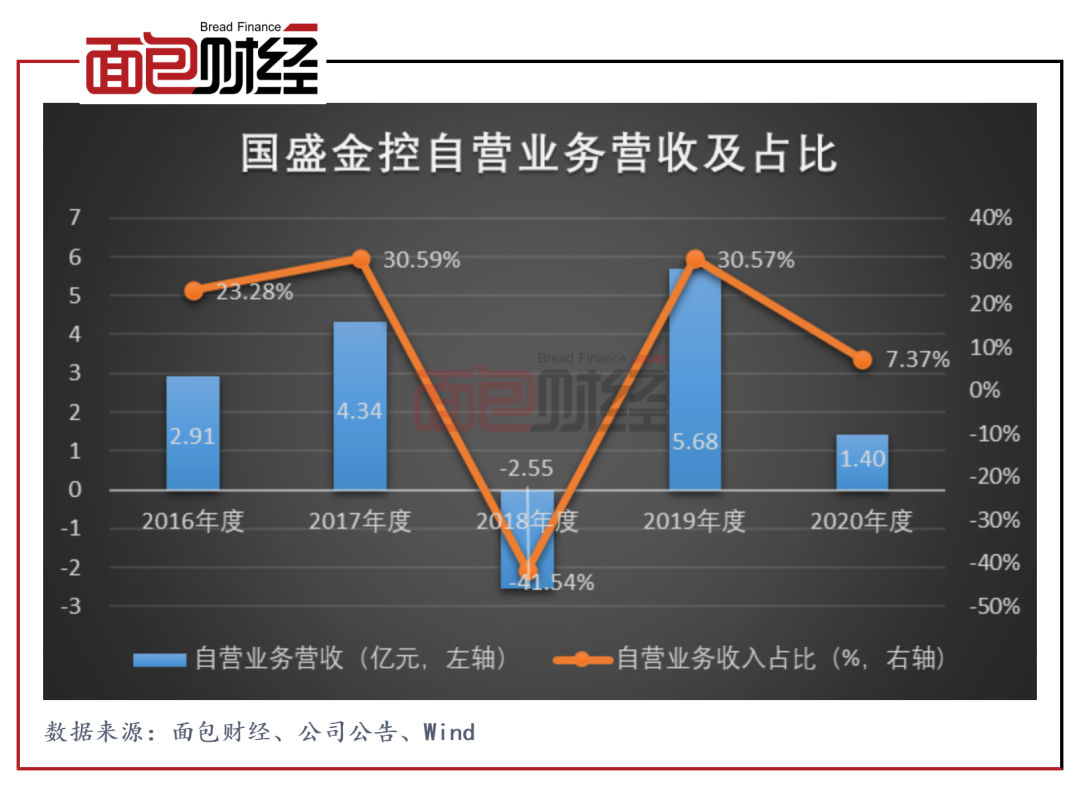 2020年,國盛金控的自營業(yè)務(wù)規(guī)模大幅下降。公司稱報告期間,出于控制風(fēng)險的考量,降低了自營業(yè)務(wù)的規(guī)模。當(dāng)期公司證券自營業(yè)務(wù)收入1.40億元,較2019年減少4.28億元,降幅達75.31%。主要受此影響,期末公司的交易性金融資產(chǎn)為56.06億元,較上年末下降44.77%。