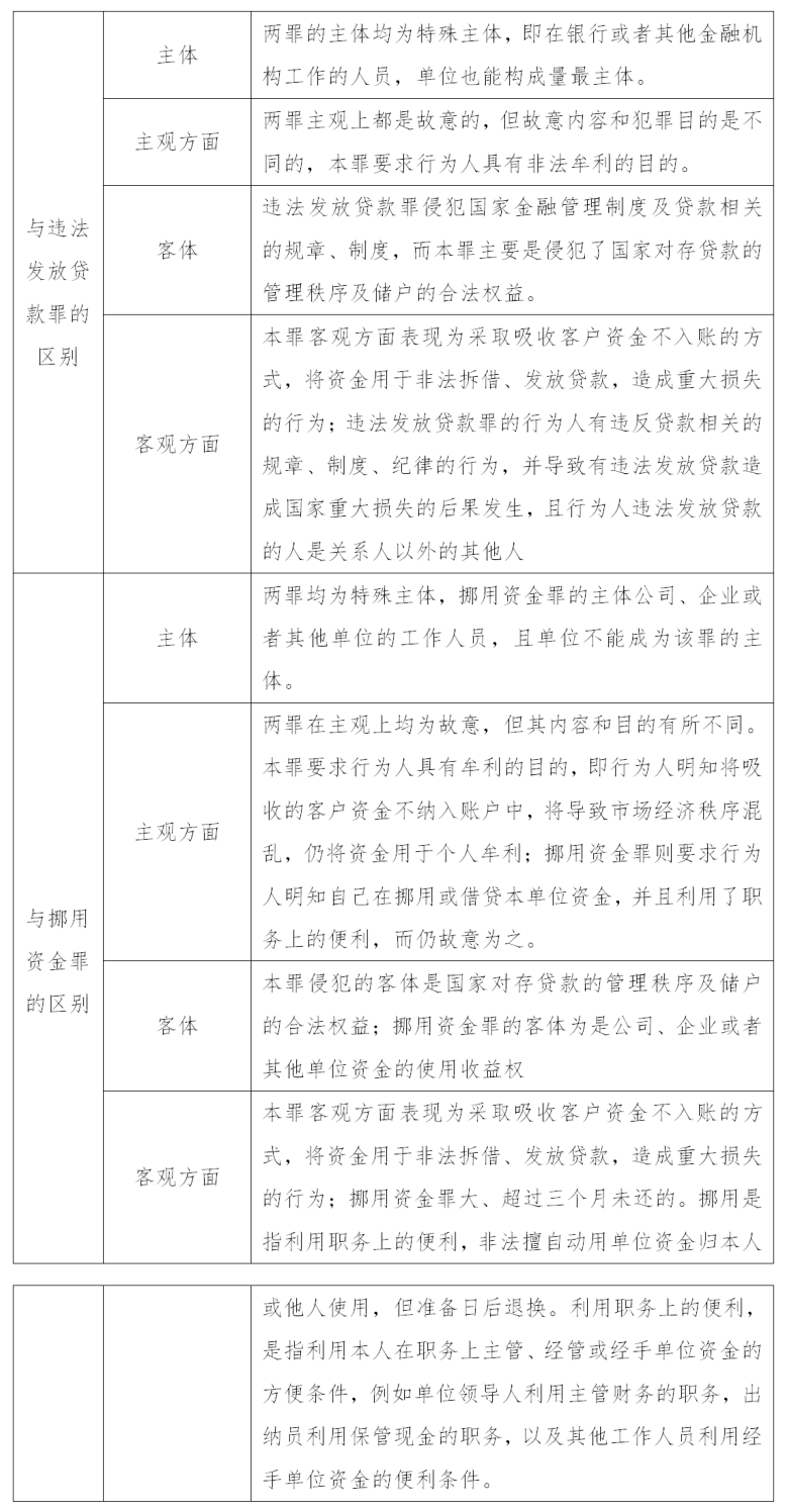 本罪客觀方面表現為采取吸收客戶資金不入賬的方式,將資金用于非法拆借、發放貸款,造成重大損失的行為。“吸收客戶資金不入賬”,是指不記入金融機構的法定存款賬目,以逃避國家金融監管,至于是否記入法定賬目以外設立的賬目不影響該罪成立。“非法拆借、發放貸款”,是指將沒有入賬的資金挪借給其他單位,或者將沒有入賬的資金作為貸款發放其他單位或個人。