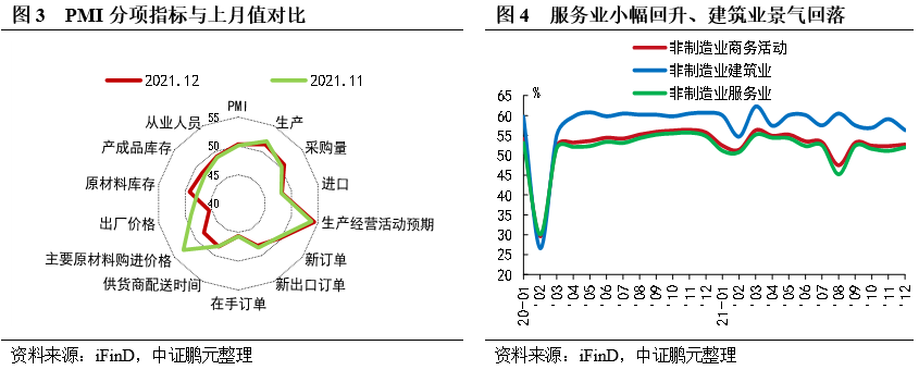 非制造業(yè)連續(xù)4個月高于臨界點,服務業(yè)小幅回升、建筑業(yè)景氣回落。非制造業(yè)商務活動指數(shù)為52.7%,服務業(yè)商務活動指數(shù)為52.0%,建筑業(yè)商務活動指數(shù)為56.3%,分別較上月上升0.4個百分點、上升0.9個百分點、回落2.8個百分點,12月受寒潮降溫天氣及“兩節(jié)”臨近等因素影響,建筑業(yè)生產擴張有所放緩。