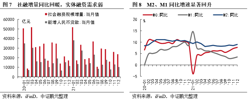 M2、 M1同比增速顯著回升:12月末,廣義貨幣(M2)余額238.29萬億元,同比增長9%,增速比上月末高0.5個百分點,比上年同期低1.1個百分點;狹義貨幣(M1)余額64.74萬億元,同比增長3.5%,增速比上月末高0.5個百分點,比上年同期低5.1個百分點;流通中貨幣(M0)余額9.08萬億元,同比增長7.7%。全年凈投放現(xiàn)金6510億元。
