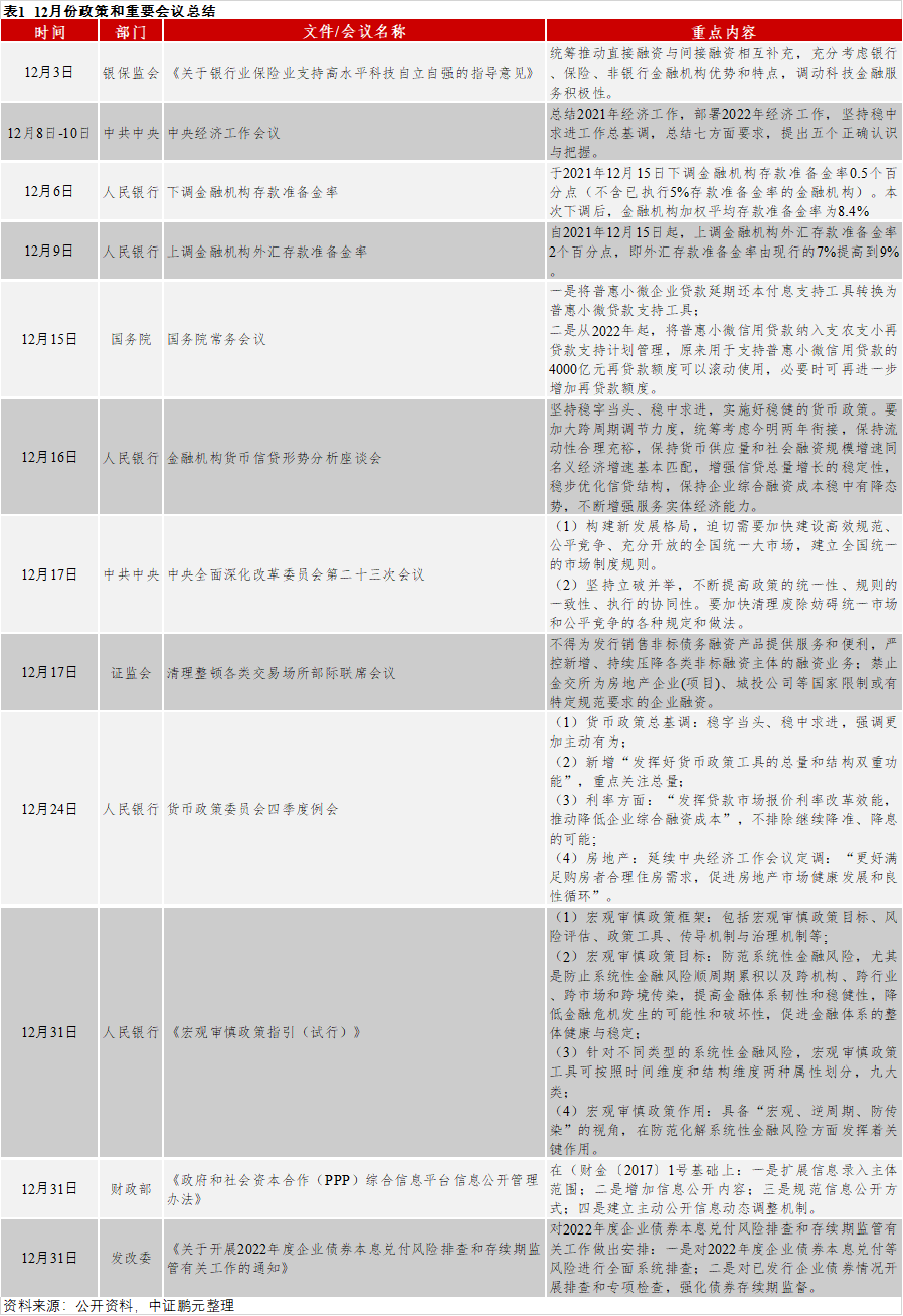 債券市場制度建設方面:12月3日,中國銀保監(jiān)會印發(fā)了《關于銀行業(yè)保險業(yè)支持高水平科技自立自強的指導意見》。12月15日,國務院常務會議部署進一步采取市場化方式加強對中小微企業(yè)的金融支持,將普惠小微企業(yè)貸款延期還本付息支持工具轉換為普惠小微貸款支持工具,將普惠小微信用貸款納入支農支小再貸款支持計劃管理。12月16日,央行召開金融機構貨幣信貸形勢分析座談會,認真學習中央經濟工作會議精神,研究當前貨幣信貸形勢和部署下一步工作。12月17日,聯(lián)席會議部署開展金交所現(xiàn)場檢查工作:禁止金交所為房地產企業(yè)(項目)、城投公司等國家限制或有特定規(guī)范要求的企業(yè)融資。12月24日,中國人民銀行貨幣政策委員會2021年第四季度(總第95次)例會召開,強調總量和結構并行,更加主動有為。12月31日,中國人民銀行發(fā)布《宏觀審慎政策指引(試行)》(以下簡稱《指引》),標志著中國宏觀審慎框架正式確立,《指引》從我國實際出發(fā),明確了建立健全我國宏觀審慎政策框架的要素,界定了宏觀審慎政策相關概念,闡述了宏觀審慎政策框架的具體內容,提出了宏觀審慎政策實施所需的支持保障。