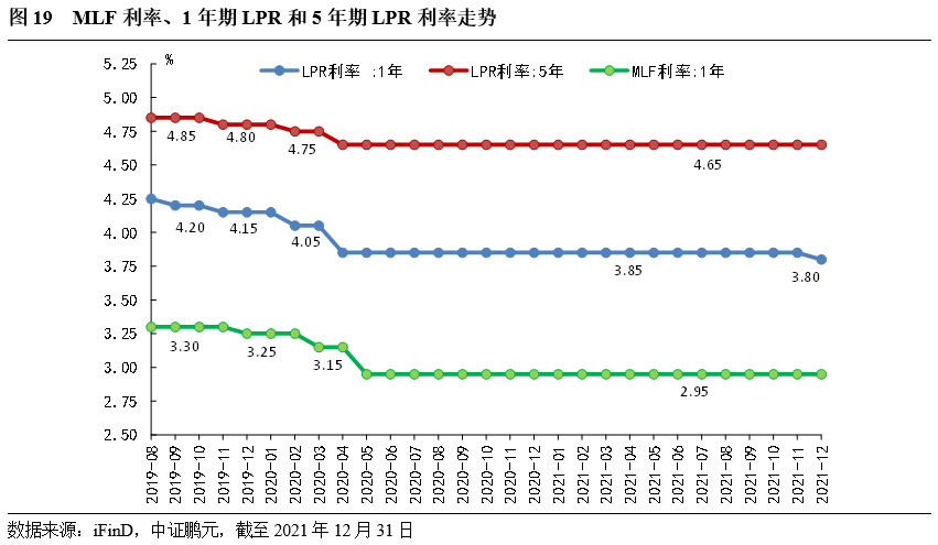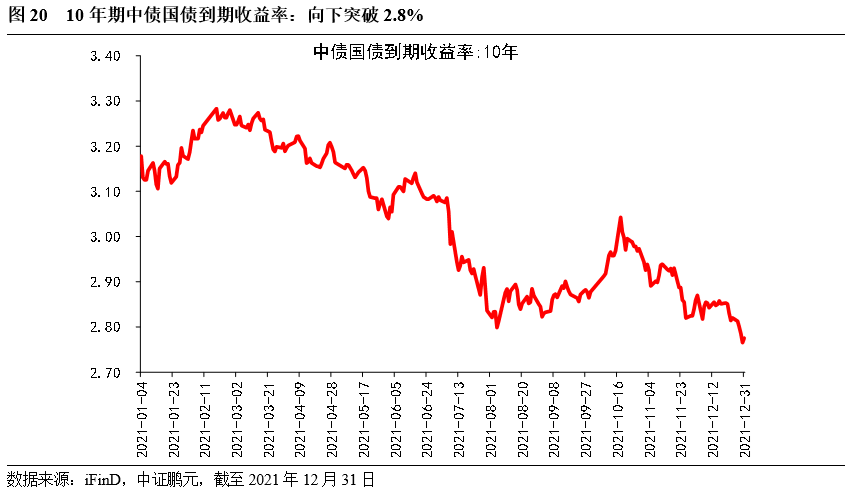12月9日,央行上調金融機構外匯存款準備金率2個百分點,即外匯存款準備金率由現(xiàn)行的7%提高到9%,主要是為應對人民幣的升值壓力,引導預期。12月20日,1年期LPR報價3.80%,較前值降低5BP,而五年期LPR報價4.65%,維持不變,此次非對稱的降息,旨在降低銀行短期負債成本,加大對實體經濟的支持,五年期LPR掣肘于房地產“房住不炒”的總基調,疊加房地產企業(yè)風險并未出清,需慎之又慎。截至2021年12月31日,10年期國債收益率向下突破此前大多數(shù)人認定的低點2.8%,達到2.78%。