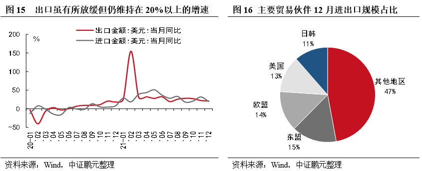 2021年12月,按美元計,出口同比20.9%,前值22.0%;進口同比19.5%,前值31.7%;順差944.6億美元,前值717.2億美元,出口仍保持高位增長。12月主要進出口國別中,東盟、歐盟、美國分別居前三位,占比15%、14%、13%。