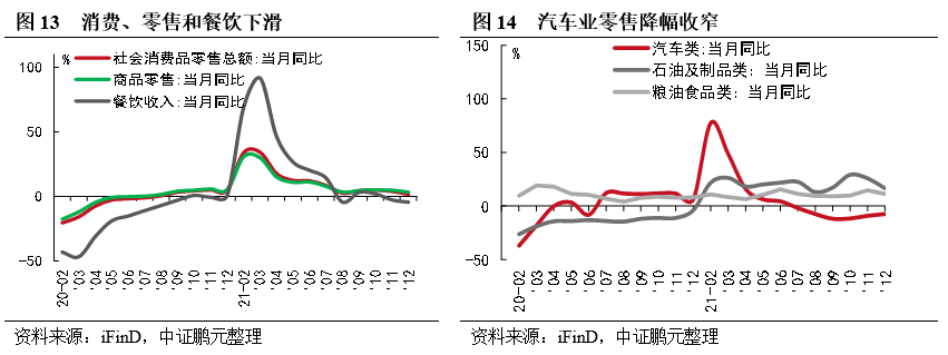 七、12月消費數(shù)據(jù)疲軟,疫情沖擊下商品零售和餐飲收入均表現(xiàn)不佳:12月份,社會消費品零售總額同比增長1.7%,商品零售和餐飲均表現(xiàn)不佳共同拖累消費,商品零售同比由4.8%繼續(xù)下滑至2.3%,下滑速度加快;餐飲收入增速為-2.2%,前值為-2.7%。