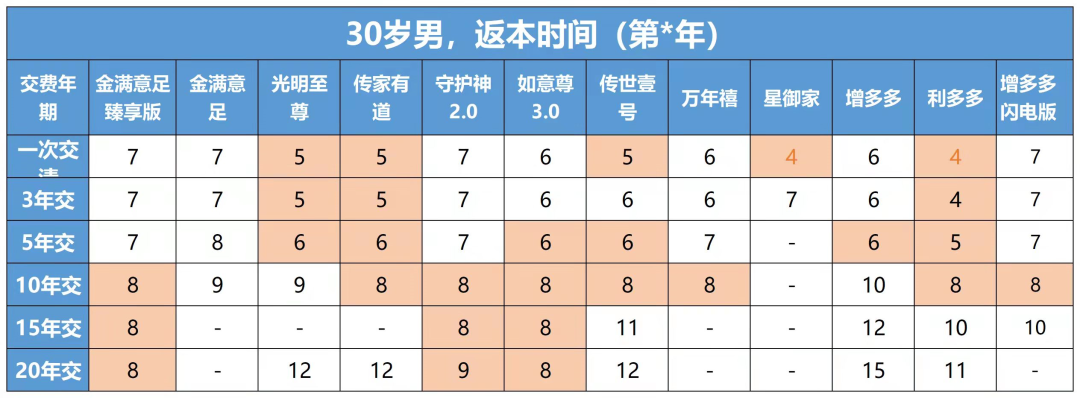 如果是3年交、5年交,那么利多多增額壽險、光明至尊、傳家有道、傳世壹號,都是回本較快的,4、5年它們的現金價值就能超過已交保費。