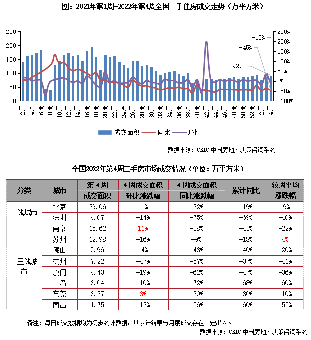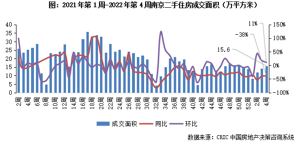 2022年第4周,南京二手住房成交面積收15.6萬平方米,環比較上周回升11%,同比跌幅收窄至38%。本周成交規?!叭B漲”且同比跌幅持續收窄,預計后續市場或保持穩中有增。