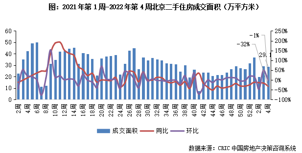 2022年第4周,北京二手房成交面積為29.1萬平方米,環比微跌1%持穩,較去年同期降幅擴大至32%。本周北京二手房市場成交較上周企穩,市場仍處于較高水平,預計短期內市場規?;蛐》鹗?。