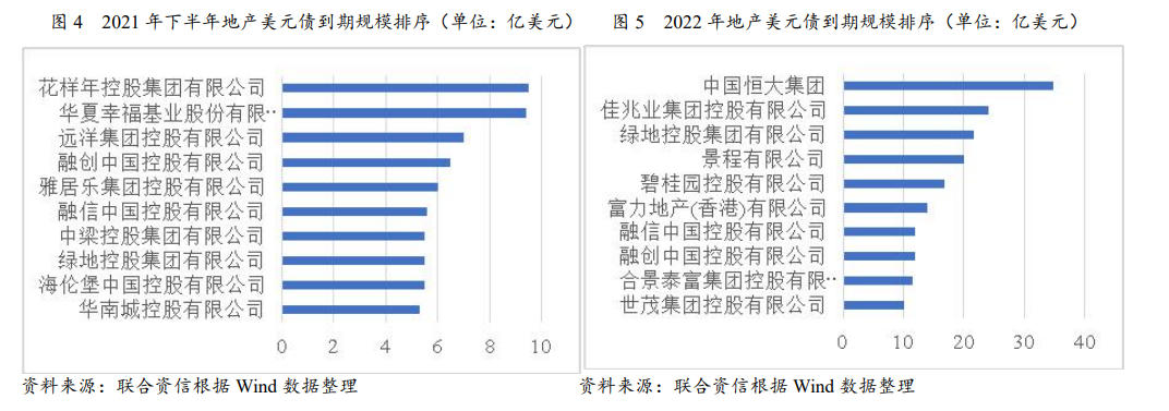 從到期規模來看,2021年下半年及2022年地產美元債到期規模較大的房企如下圖所示。