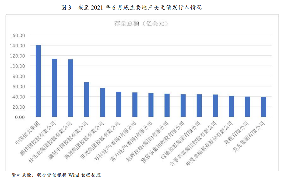 從存量規模來看,中國恒大集團、碧桂園控股有限公司、佳兆業集團控股有限公司美元債存量規模位居市場前列。
