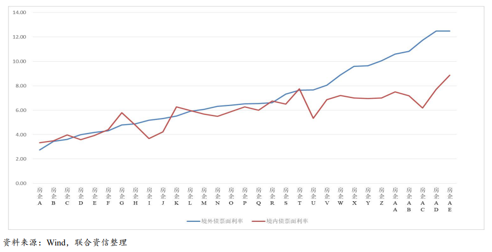 由于部分房地產企業綜合融資成本難以獲取,我們采用其債券發行票面利率作為篩選標準。我們以2020年以來,境內外市場同時發行債券的企業為研究對象,對其發行債券的票面利率做簡單的算數平均進行對比。考慮到境外美元債償債資金來源除借新還舊外,實質來自于境內公司,因此我們主要選取更能反映公司的真實信用風險的境外控股公司作為分析標的,詳見下圖。