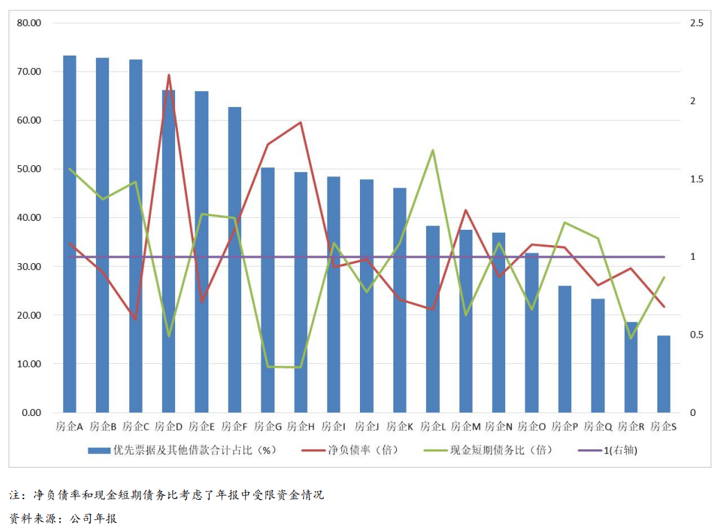 以美元債發債利率較高的開發商為標的,我們統計其融資渠道及相關債務指標發現,下圖中部分企業的現金流情況值得關注。需要注意的是,上述債務指標的計算并未考慮表外債務,且部分企業未披露預售監管賬戶資金情況,企業的實際債務指標表現可能要差于下圖所示。
