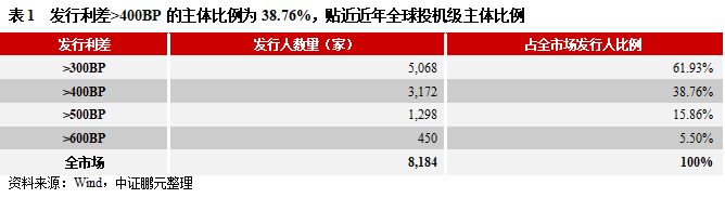 其中,發行利差>400BP的發行人比例38.76%,較為貼合近年來國際投機級債券主體的比例水平,因而本文將高收益債的標準定為發行利差>400BP。同時,考慮到目前我國高收益債研究中,大多數研究機構的高收益債樣本占整體信用債的比例在10%~25%之間,因而為了貼合國內高收益債研究,給國內高收益債投資者更多參考,本文一并統計發行利差>400BP、>500BP和>600BP三類高收益債主體的分布和違約情況。