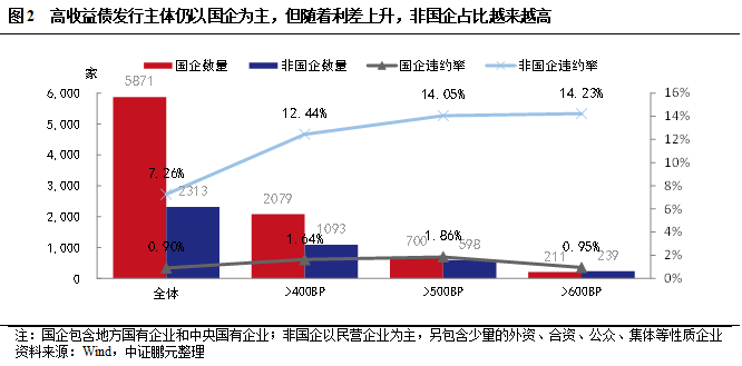 接下來,我們按企業性質來觀察高收益債發行主體的分布和違約特征。我們將樣本分為兩類:一類是國企,包含地方國有企業和中央國有企業(我們認為在研究高收益債時,國企和央企具有類似特征,因而將兩類企業歸為同一類企業統計),第二類是非國企,其中以民營企業為主,占比在80%以上,另包含少量的外資、合資、公眾、集體等性質企業,總體體現民營企業的特征。