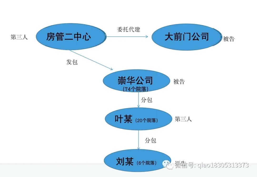 根據查明事實,發包人為房管二中心,大前門公司為代建單位,承包人為崇華公司,崇華公司將部分工程分包給了葉某,劉某與崇華公司、大前門公司均未簽訂施工合同,也未提供證據證明存在事實施工合同關系,故劉某與二被告不存在施工合同關系。