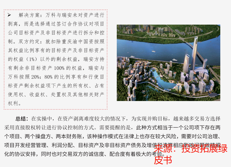 2)非目標資產(chǎn)的所有者權(quán)益部分不僅僅要在拆分時點大于0,更要考慮在標的資產(chǎn)完成開發(fā),收購方退出時,非標的資產(chǎn)權(quán)益部分仍然要大于0,否則就會出現(xiàn)標的資產(chǎn)部分替非標的資產(chǎn)背債的情況,如果合作方有其他足值資產(chǎn)替非標的資產(chǎn)權(quán)益做擔保,也可接受。