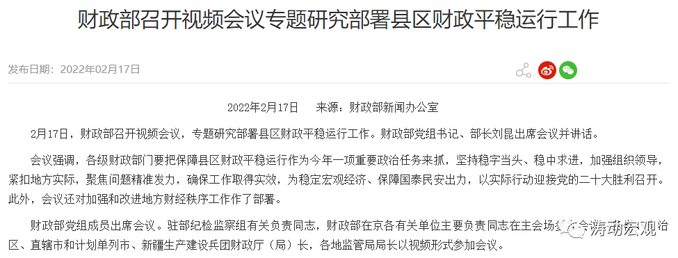 (一)2022年2月17日,財政部召開視頻會議,專題研究部署區縣財政平穩運行工作,這應是一個非常值得關注的信號,表明當前高層已經開始關注區縣財政的平穩運行問題,這其后的背景可能與近期徐州豐縣問題有關,即當前徐州豐縣地區的融資已經受到一定程度的沖擊。同時也表明,當前部分區縣財政可能遇到了一定現實的困難和問題,需要特別呵護、小心應對。
