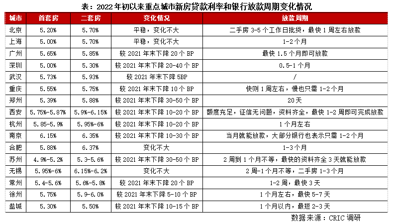 事實上,從城市執行層面來看,信貸“松動”已有征兆,據CRIC調研的10多個熱點城市信貸情況顯示,多數城市房貸利率均有了不同程度的下調,較2021年末下調幅度在10-50BP不等,蘇州首套房貸利率更是“一降再降”,跌破5%,外資銀行對于客戶資質較好的公務員群體可低至4.55%。