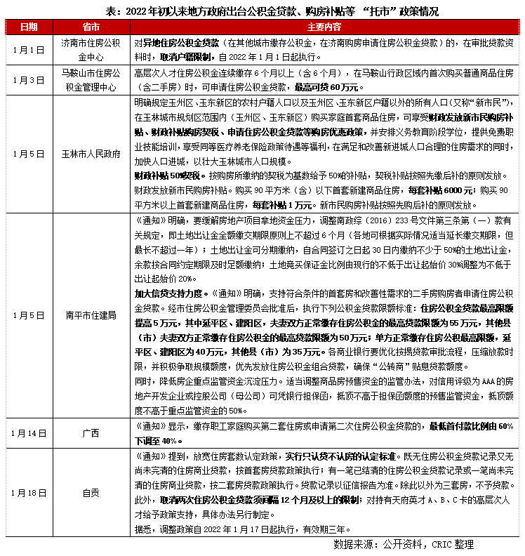 除了熱點城市下調貸款利率,加速放款周期之外,我們監測到2022年開年以來部分內陸弱二三線城市也開始逐步放寬公積金貸款政策“托市”:濟南取消異地公積金貸款戶籍限制,馬鞍山、南平等提升了公積金貸款額度,北海二套申請公積金貸款降低首付比例至四成,四川自貢更是取消兩次住房公積金貸款須間隔12個月及以上的限制,實行認貸不認房等。