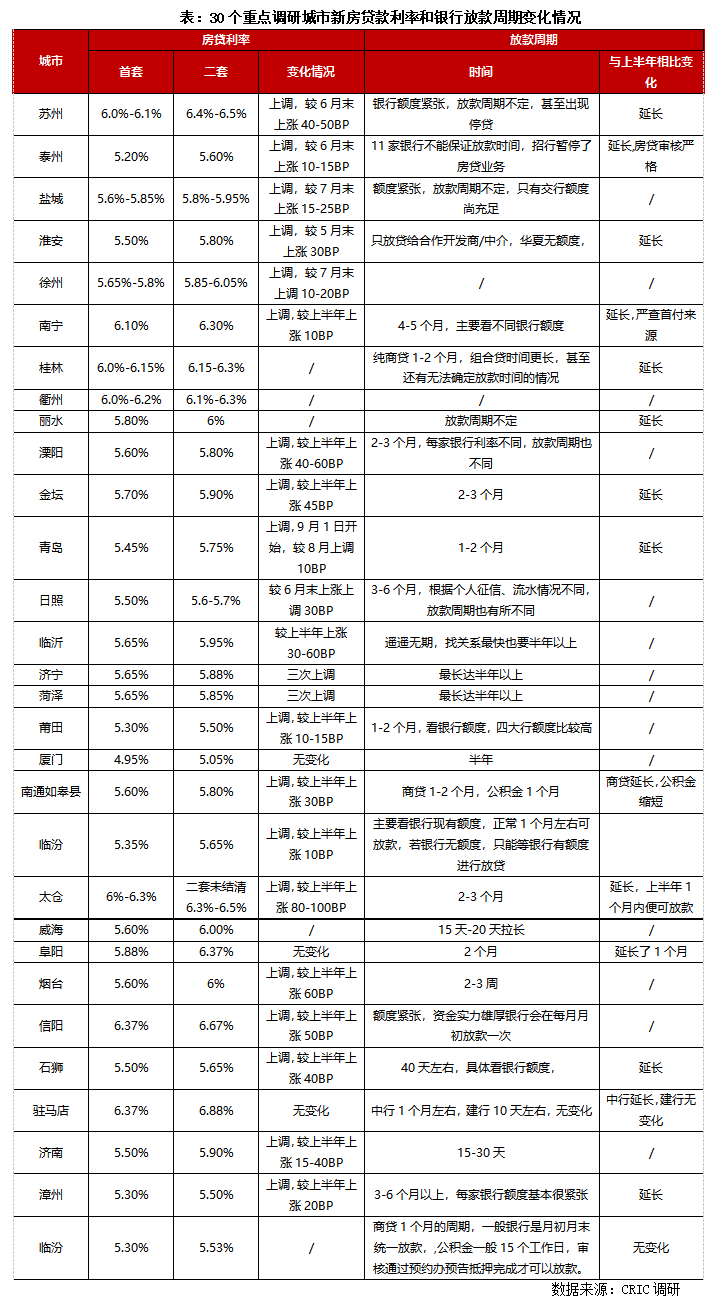 自年初央行推出房地產(chǎn)貸款集中度管理制度以來,各地“上行下效”,捂緊錢袋子,也出現(xiàn)了房貸額度緊張、放款周期拉長、貸款利率上調(diào)等現(xiàn)象。不過近期市場傳聞,下半年貨幣政策將向?qū)捫庞棉D(zhuǎn)向,推動銀行加碼信貸投放,部分銀行已接到窗口指導(dǎo)加大8月末的信貸投放,如若傳聞屬實,勢必會帶動社會融資規(guī)模總量穩(wěn)步回升,對地產(chǎn)行業(yè)是否也存在一定的利好刺激?帶著這樣的疑問,我們于近期調(diào)研了30個重點城市的房貸利率和回款周期變動情況。