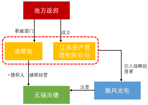 由地方政府職能部門組成的清算管理人在對(duì)無錫尚德進(jìn)行調(diào)研的基礎(chǔ)上,與債權(quán)人達(dá)成一致讓企業(yè)得以繼續(xù)經(jīng)營(yíng)。江蘇省人民政府同意由無錫市國(guó)聯(lián)發(fā)展(集團(tuán))有限公司作為主發(fā)起人設(shè)立江蘇省資產(chǎn)管理有限公司。
