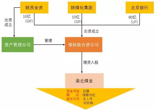 2016年底,陜西金資、陜煤化和北京銀行協(xié)議分別出資10億、10億和80億成立債轉(zhuǎn)股合資公司,合資公司100億元債轉(zhuǎn)股資金對(duì)陜煤化全資子公司陜西陜煤榆北煤業(yè)有限公司(以下簡(jiǎn)稱“榆北煤業(yè)”)進(jìn)行注資,完成債轉(zhuǎn)股。