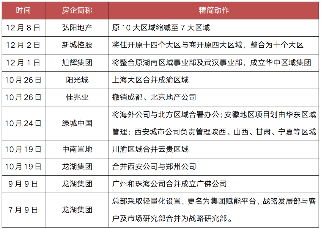 三條紅線以來,行業進入管理紅利時代,房企紛紛對其組織架構進行調整,裂變與合并是重點調整方向,核心是向管理要效益,實現區域深耕。四季度開始,房企再次掀起組織架構精簡熱潮,包含事業部整合、區域公司合并、撤銷部分區域公司等。